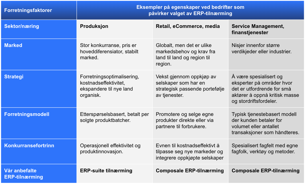 Tabellen nedenfor gir noen forenklede eksempler på virksomhetskarakteristikker som påvirker valget av ERP-tilnærming basert på noen forretningsfaktorer.